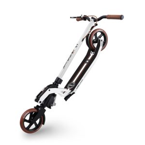 - 2-wheel foldable kick scooter for adults (aged 14Y+) with a patented 1-second piston-assisted kick & fold system: kick the mechanism at the bottom of the column to have the rear scooter wheel automatically lift, putting the kick scooter with handbrake into folded mode. Trolley mode compatible.
